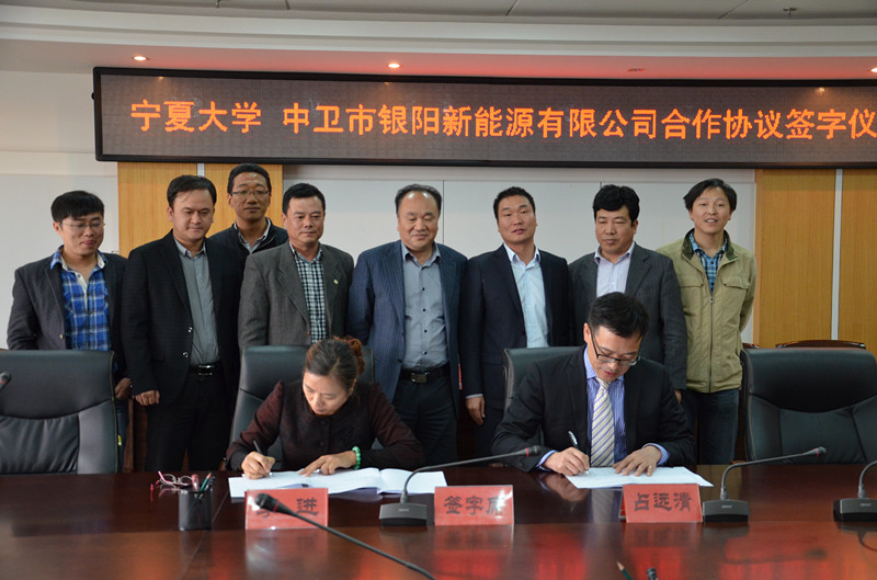 2014年5月9日,av狼 、中卫市银阳新能源有限公司合作协议签字仪式在av狼 A区主楼13楼会议室举行。中卫市银阳新能源有限公司副总裁占远清、总裁助理狄红祥,av狼 副校长张成、科技成果转化中心主任刘成敏、副主任贺海明、宁夏光伏材料重点实验室主任李进、副主任何力军等参加了仪式。占远清、李进分别代表双方签字。