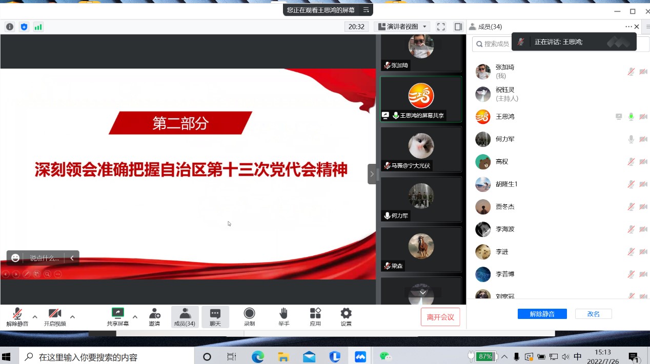 2022726日下午,学院通过腾讯视频会议形式召开《深入学习贯彻自治区第十三次党代会精神》宣讲会,邀请马克思主义学院王思鸿教授主讲。会议由常务副院长何力军同志主持,全体师生参加。