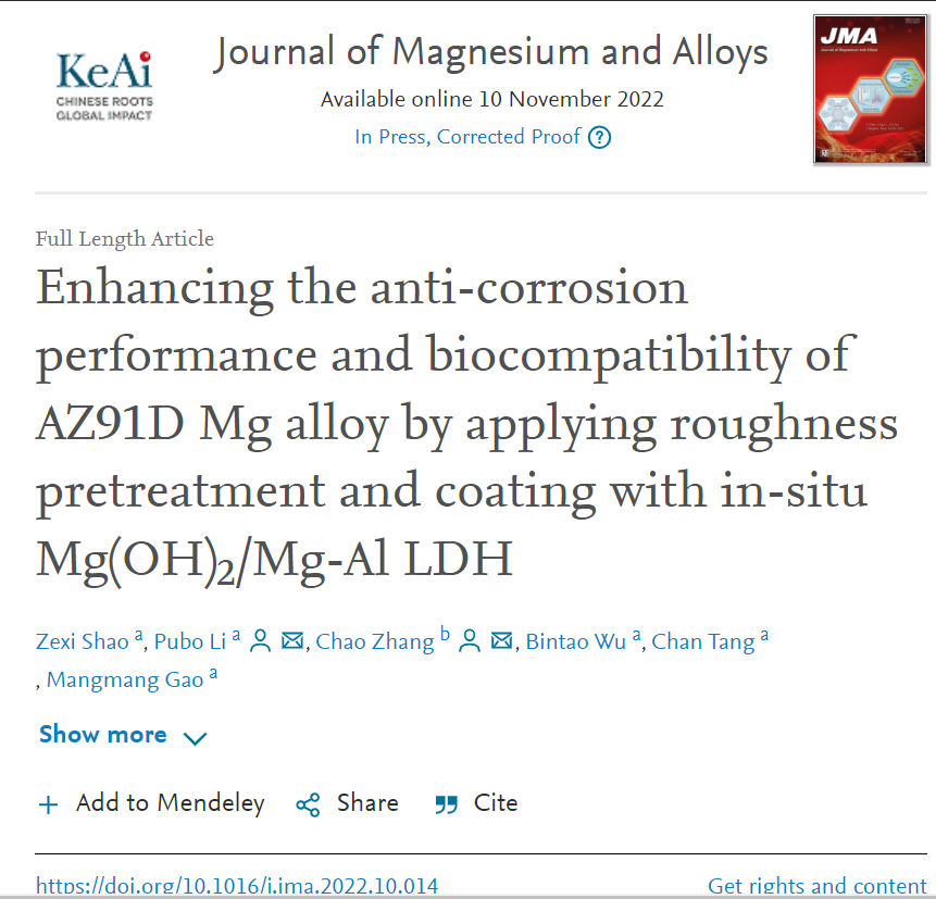 先进工程材料平台李普博副教授、吴斌涛副教授和高忙忙研究员团队在镁合金腐蚀防护和生物相容性能研究领域取得重要进展,工作以“Enhancing the anti-corrosion performance and biocompatibility of AZ91D Mg alloy by applying roughness pretreatment and coating with in-situ Mg(OH)2/Mg-Al LDH”为题发表于镁合金材料国际顶级学术期刊《Journal of Magnesium and Alloys》,影响因子达到11.8。学院2022届硕士研究生邵泽西为第一作者,av狼
