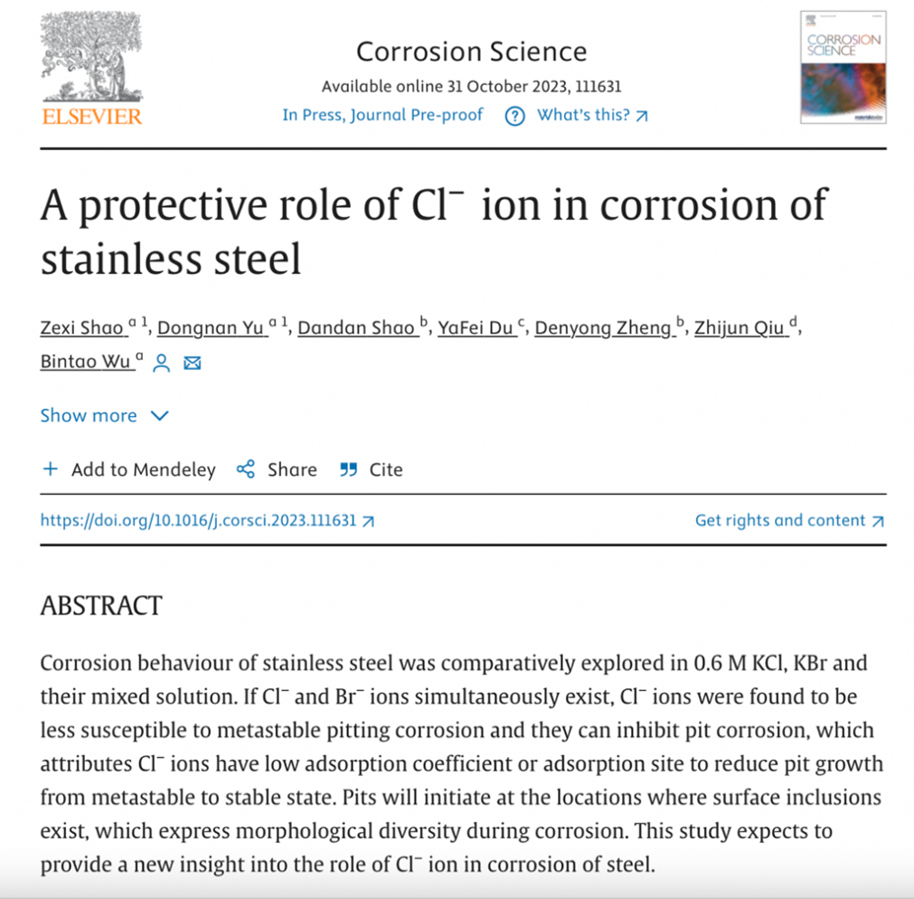 近日,av狼 吴斌涛副教授团队联合中船黄埔文冲船舶有限公司邵丹丹工程师团队在金属腐蚀研究中取得新进展。团队研究发现氯离子在钢腐蚀中可以起到一定的防护作用,相关成果以“A protective role of Cl−ion in corrosion of stainless steel”为题发表在国际知名期刊《Corrosion Science》(中科院一区TOP),av狼 为第一单位,邵泽西博士为第一作者,吴斌涛为通讯作者。