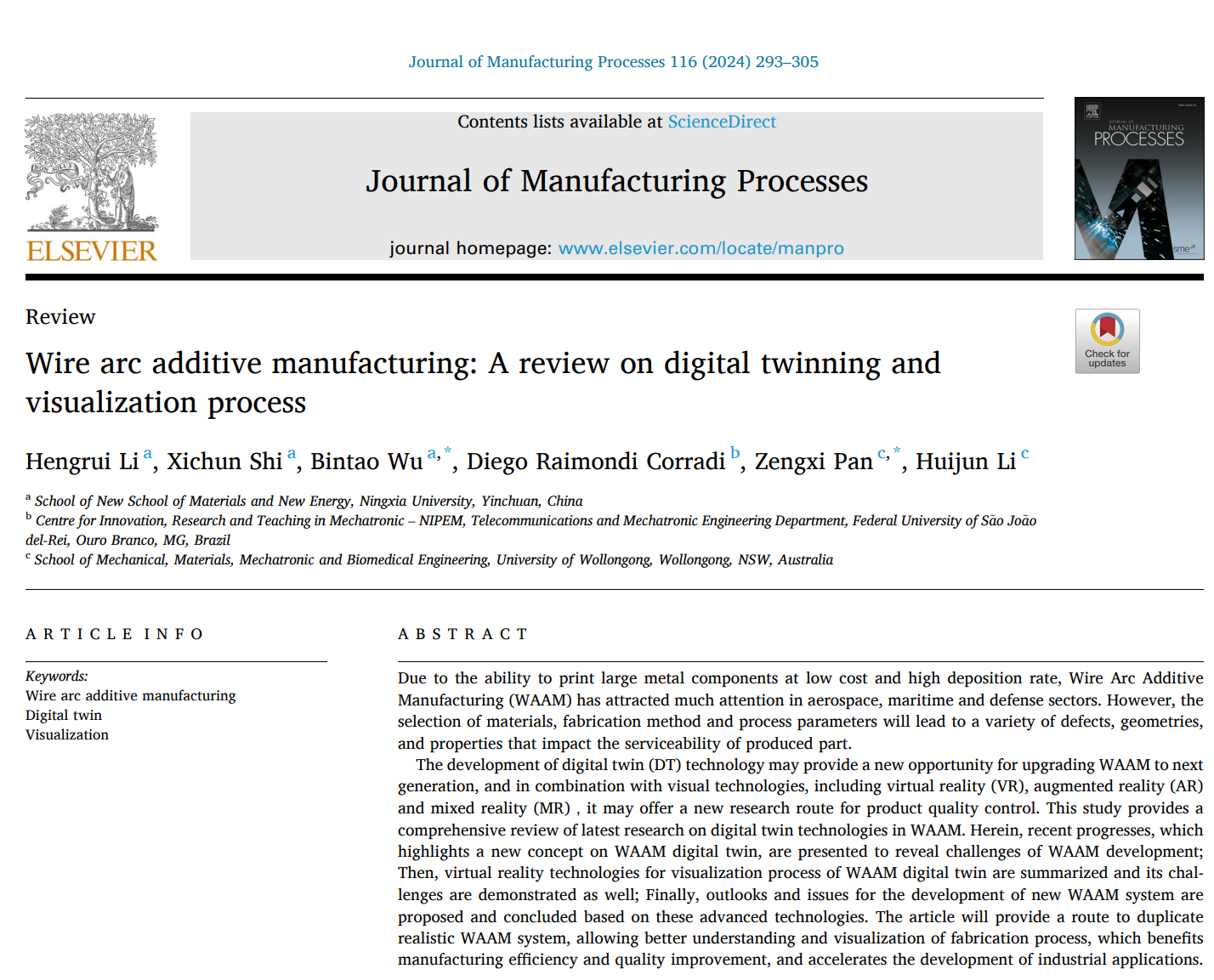 近日,av狼 吴斌涛教授课题组联合巴西圣若昂-德雷UFSJ联邦大学、澳大利亚伍伦贡大学在国际知名期刊《JournalofManufacturing Processes》(中科院一区TOP)发表题为“Wire arc additive manufacturing: A review on digital twinning and visualization process”的高水平综述文章。文章在对电弧熔丝增材制造挑战回顾的基础上,总结、分析新型的电弧熔丝增材制造数字孪生技术及其可视化,并对其未来发展方向进行了展望。av狼 为论文第一单位,硕士研究生李恒芮为第一作者,av狼 吴斌涛教授、澳大利亚伍伦贡大学ZengxiPan教授为共同通讯作者。