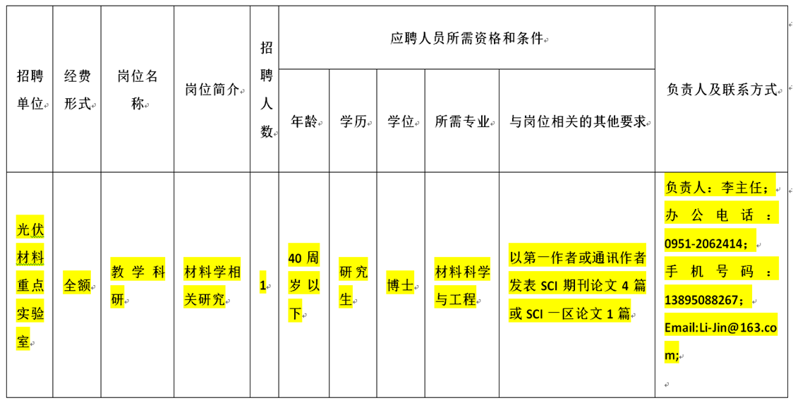 宁夏光伏材料重点实验室2019年下半年招聘公告