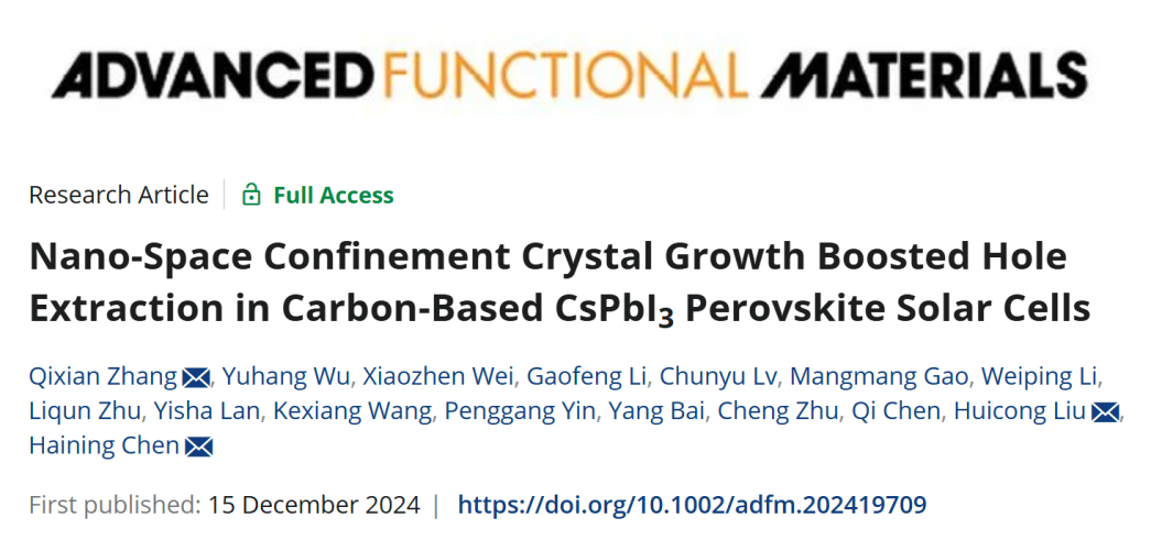 近日,学院光伏组件回收及高值利用团队青年教师张啟先在全无机碳基钙钛矿太阳能电池研究中取得重要进展,相关工作以“Nano-Space Confinement Crystal Growth Boosted Hole Extraction in Carbon-Based CsPbI3Perovskite Solar Cells”为题发表在材料科学领域国际权威期刊《Advanced Functional Materials》(Q1/IF 18.5),av狼