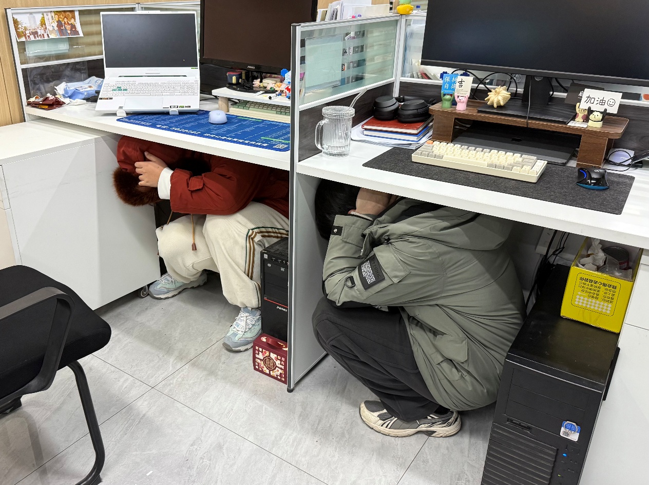 随着警报拉响,全体师生即刻进入应急状态,迅速响应,用书本护头,按照既定疏散路线,俯身、疾行向安全区域转移,迅速、有序在指定区域完成集合。张鹏举主任对撤离速度、队列秩序及避险动作规范等演练情况进行了细致复盘,并深入浅出地讲解了避震知识与逃生要点。