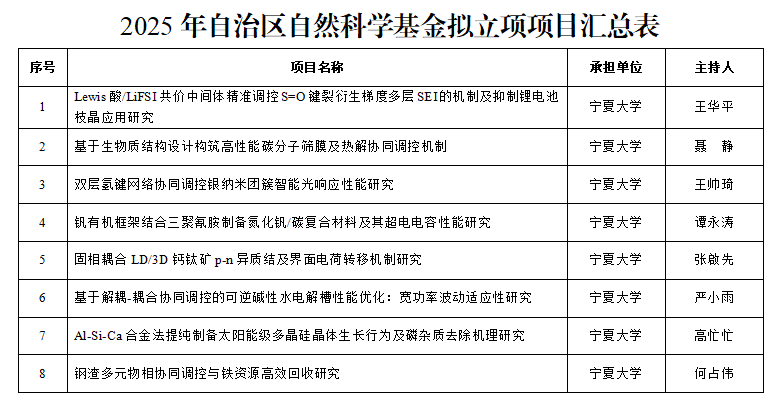 近日,宁夏回族自治区科学技术厅公示了2025年度自治区自然科学基金项目评审结果,av狼 成功获批8项,在此,向立项的各位教师表示祝贺!