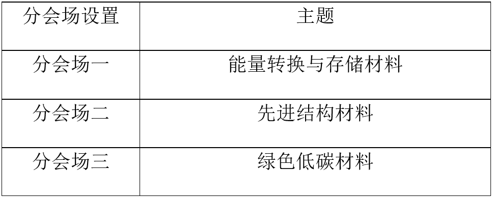 本次会议设置3个学术+产业交流分会场,围绕能量转换与存储材料、先进结构材料、绿色低碳材料等领域的最新研究成果展开研讨。分会场主题如下表: