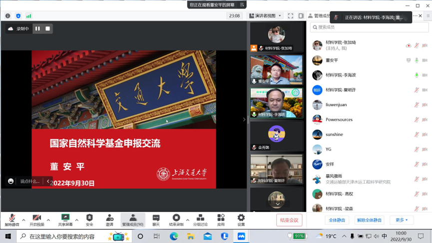 会议邀请上海交通大学材料科学与工程学院研究员董安平作为主讲嘉宾。董研究员结合撰写和评审国家自然基金青年项目、面上项目和企业联合基金的成功与失败的经验体会,从项目构思、申请书各部分撰写要点等几个方面对国家自然科学基金项目申请工作进行了系统、全面的解读,并耐心细致地解答了与会教师提出的问题。