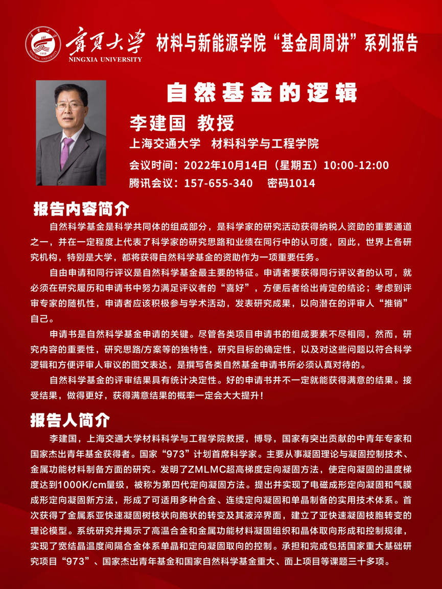 2022年10月14日上午,学院通过线上会议形式举办了“基金周周讲”第二期报告。报告由李海波副院长主持,上海交通大学材料科学与工程学院李建国教授主讲,学院全体教师参加,全国高校相关领域教师共计500余人聆听了报告。