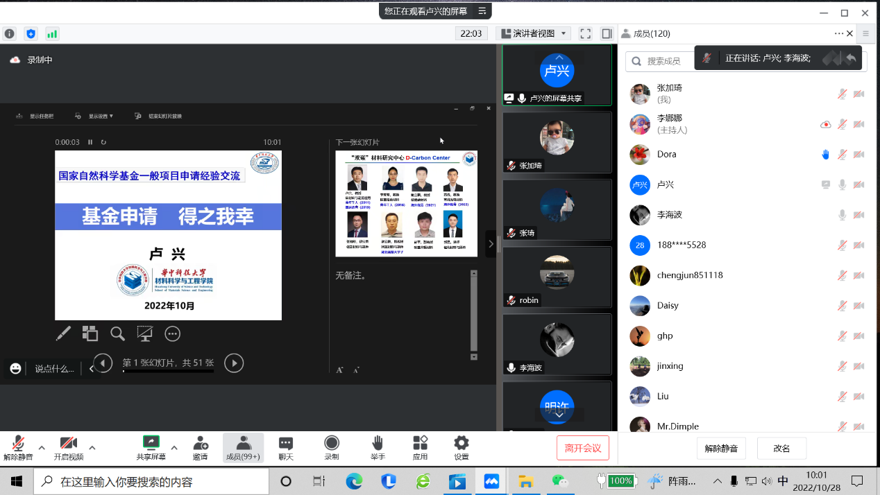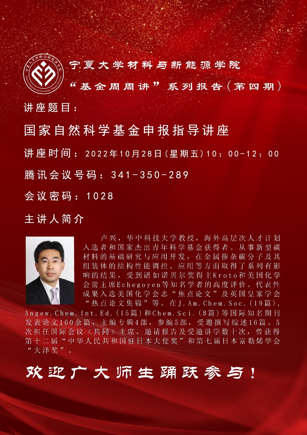 2022年10月28日上午,学院通过线上会议形式举办了“基金周周讲”第四期报告。报告由李海波副院长主持,华中科技大学材料科学与工程学院卢兴教授主讲,学院全体教师参加,全国高校相关领域教师聆听了报告。