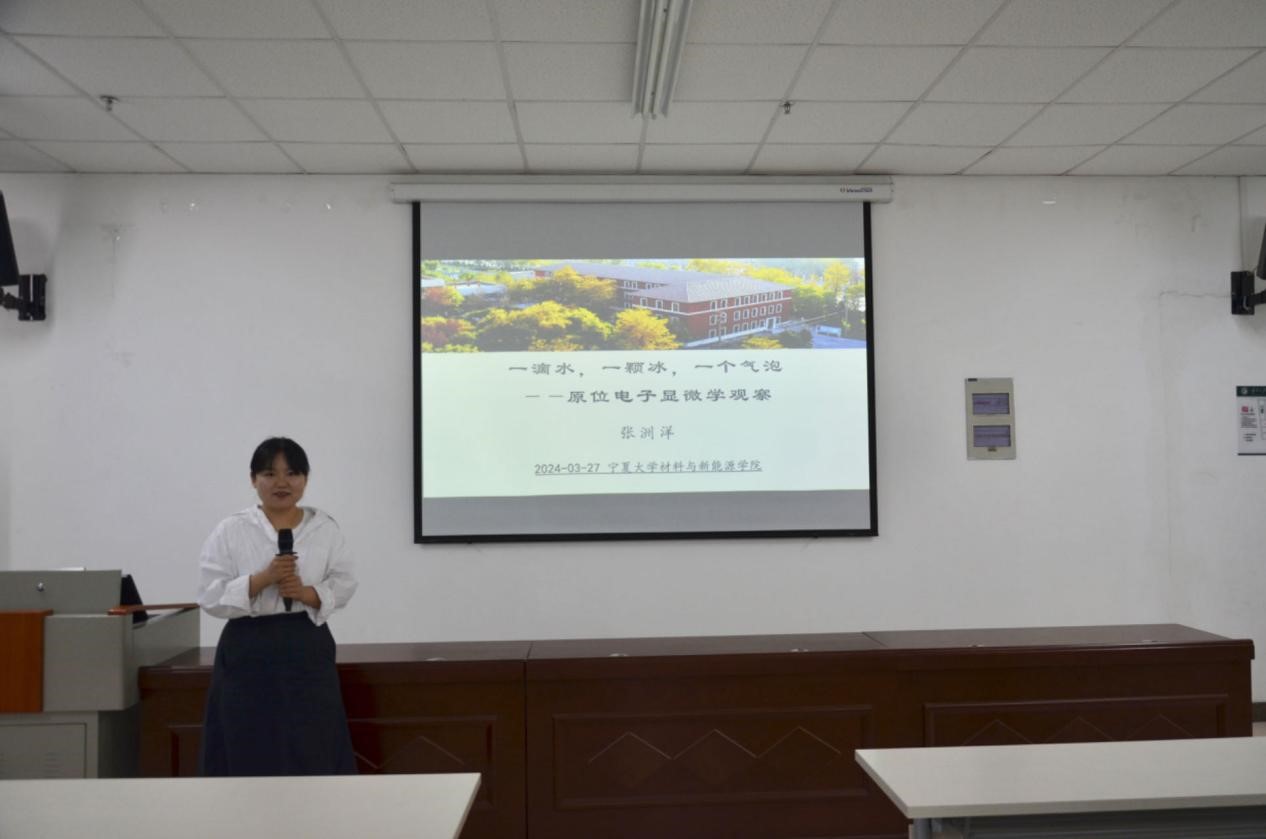 2024年3月27日下午在贺兰山校区科技楼B301会议室,张洲洋博士作了题为“一滴水,一颗冰,一个气泡——原位电子显微镜学观察”的学术报告。这是av狼 2024年度举办的第二次学术报告会。报告会由马品博士主持,学院全体师生及学校相关领域师生聆听了报告。